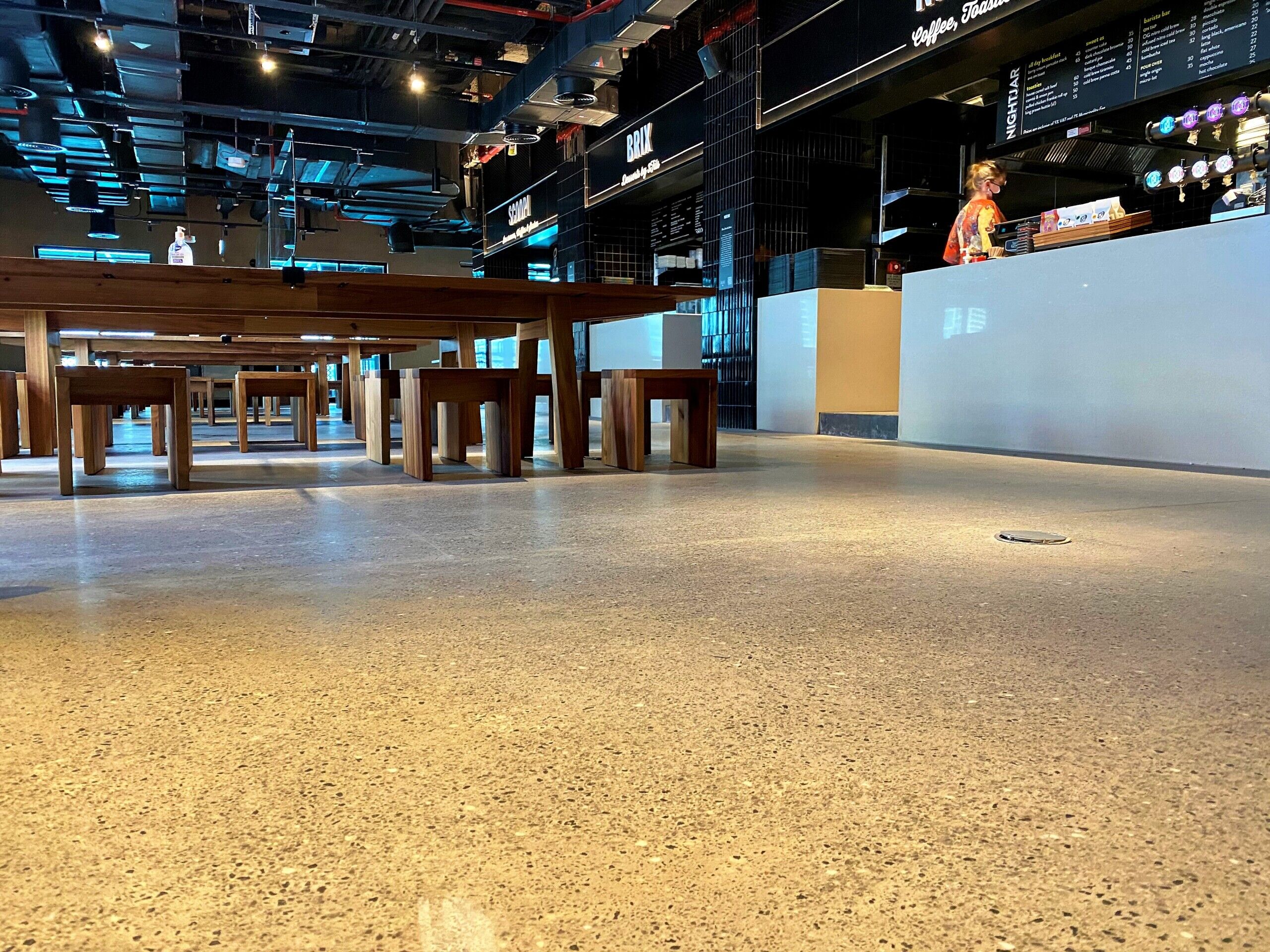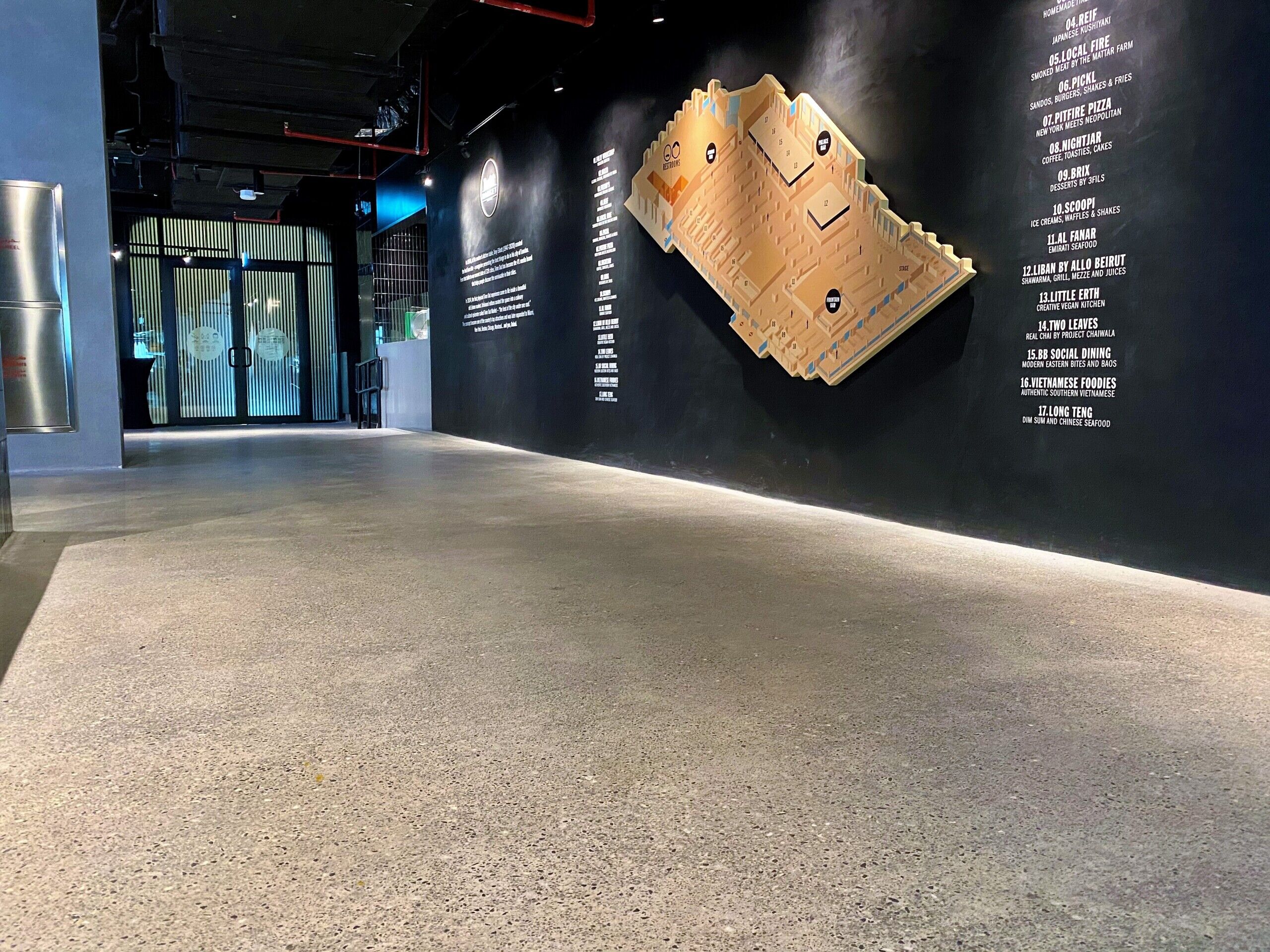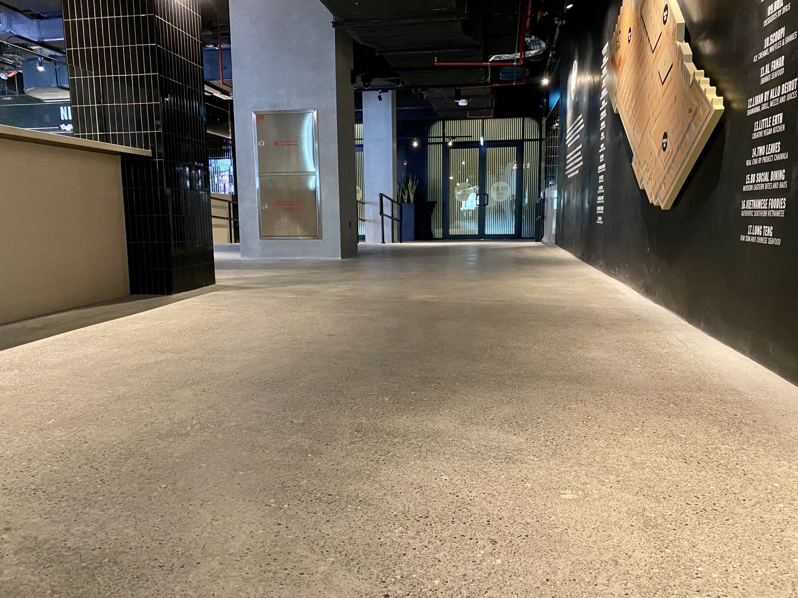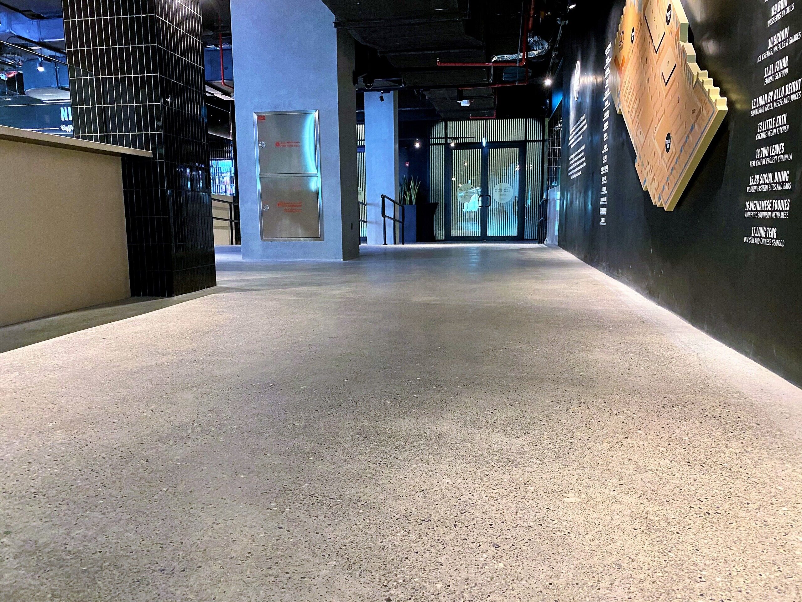 Throughout the entire Time Out Market Dubai, our team of craftsmen were selected to provide a decorative polished concrete with a customised finish to meet the design requirements of the client. Our team worked closely with Dutco Tennant to enhance the aesthetic and provide a solution that promises longevity and easy maintenance. Starting with the application of the cementitious screed, our workforce placed each individual stone in a bespoke formation to keep the design consistent throughout the whole food market. Once applied, our team lightly polished the surface, exposing the custom aggregates and creating a smooth seamless surface. The flooring system is capable of withstanding the continuous foot traffic of the food market and the seamless, easy to clean, qualities will continue to benefit the staff members for years to come.