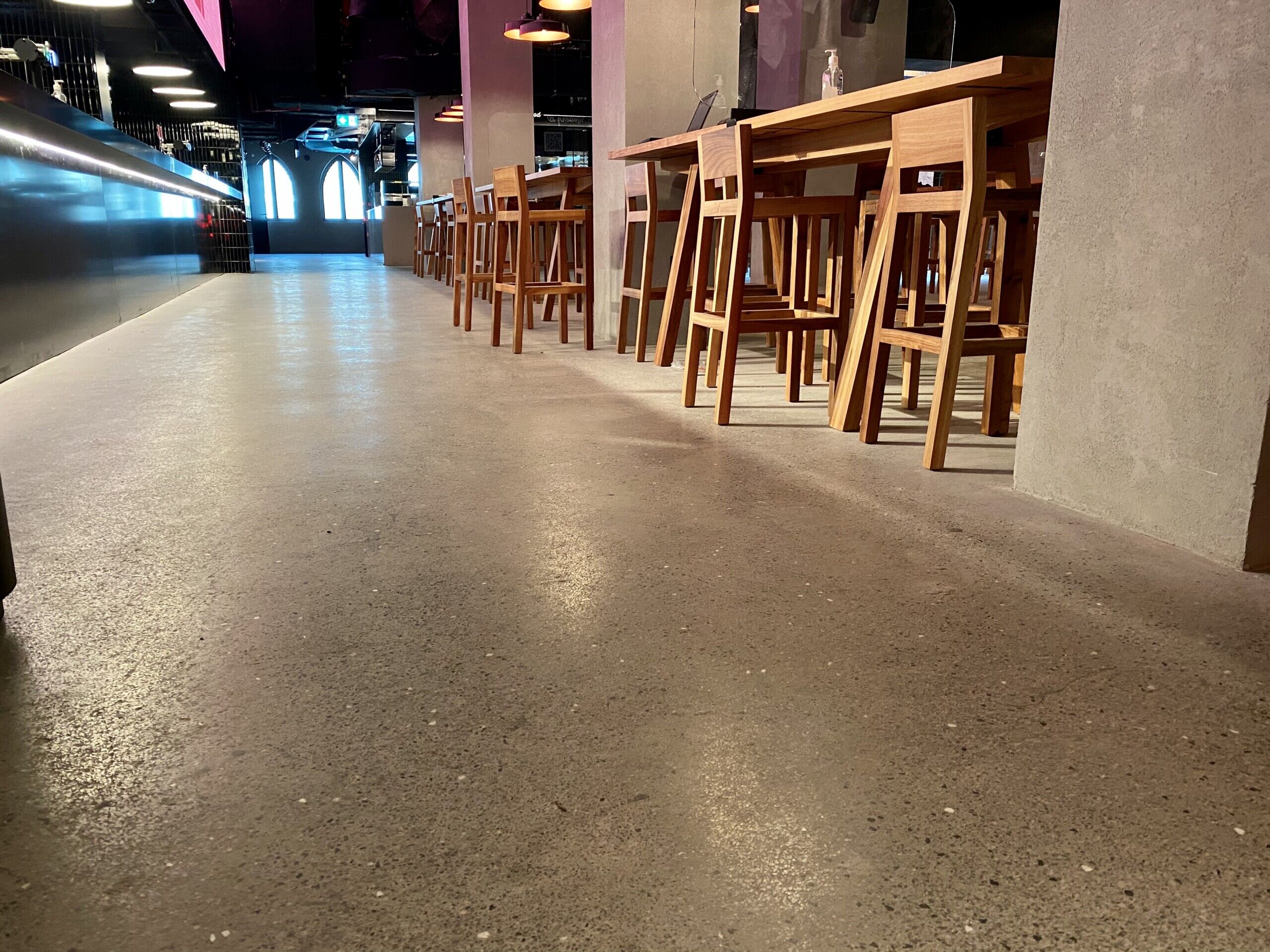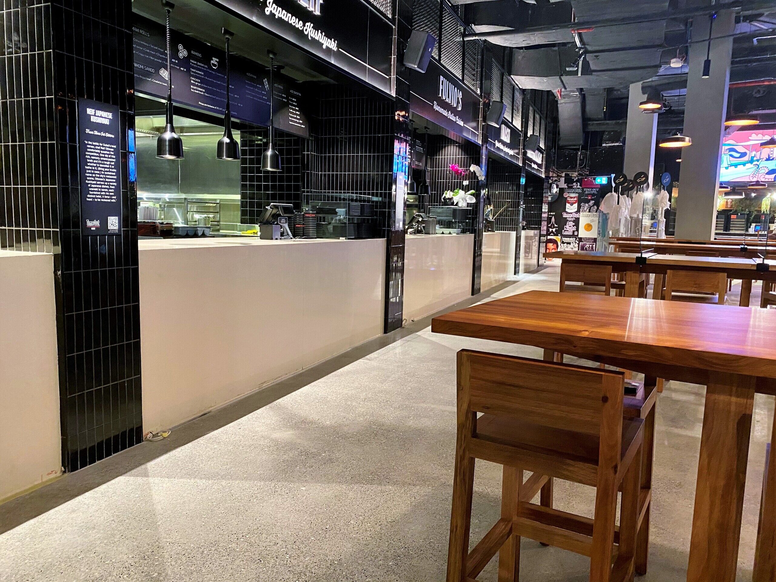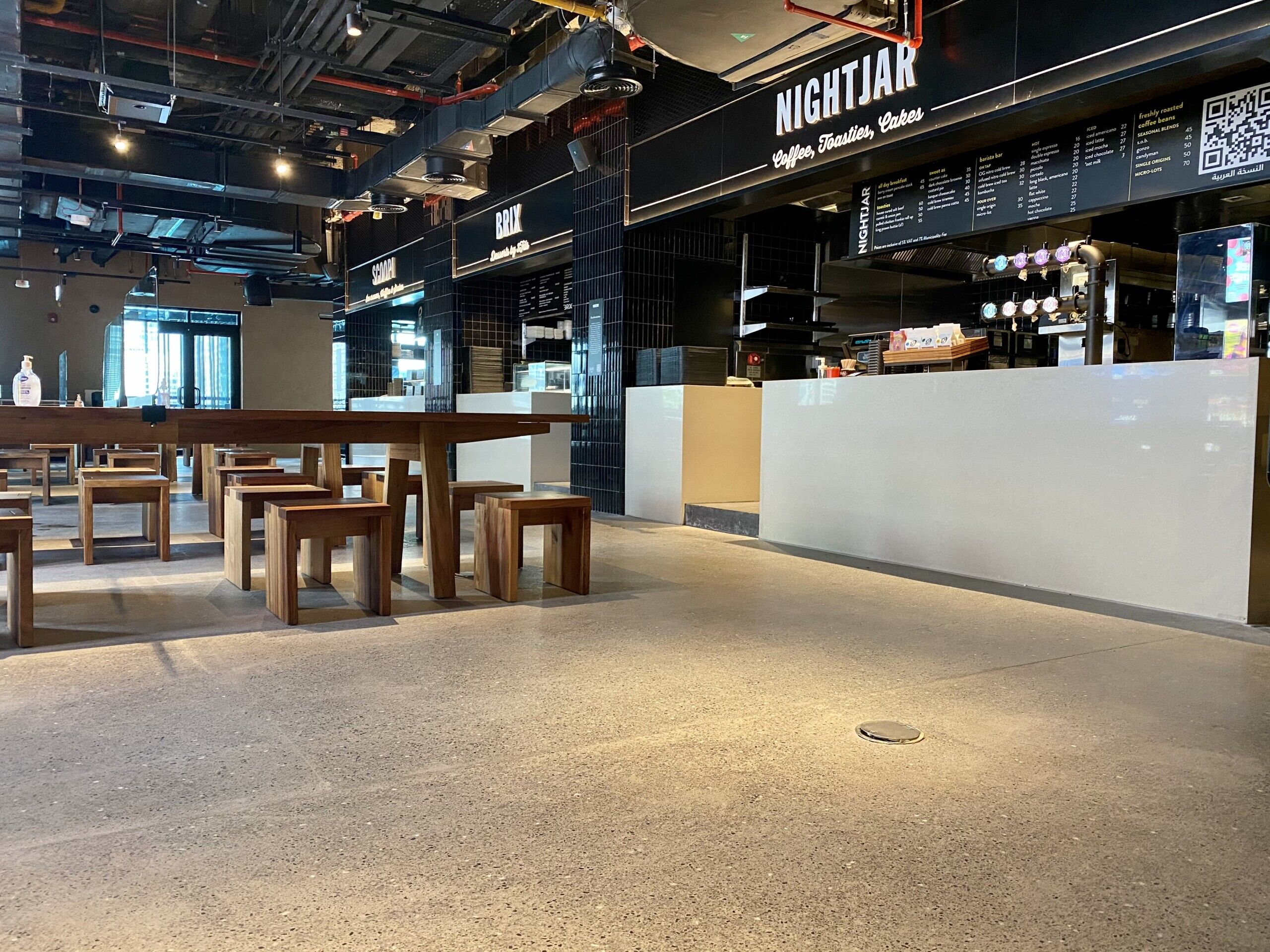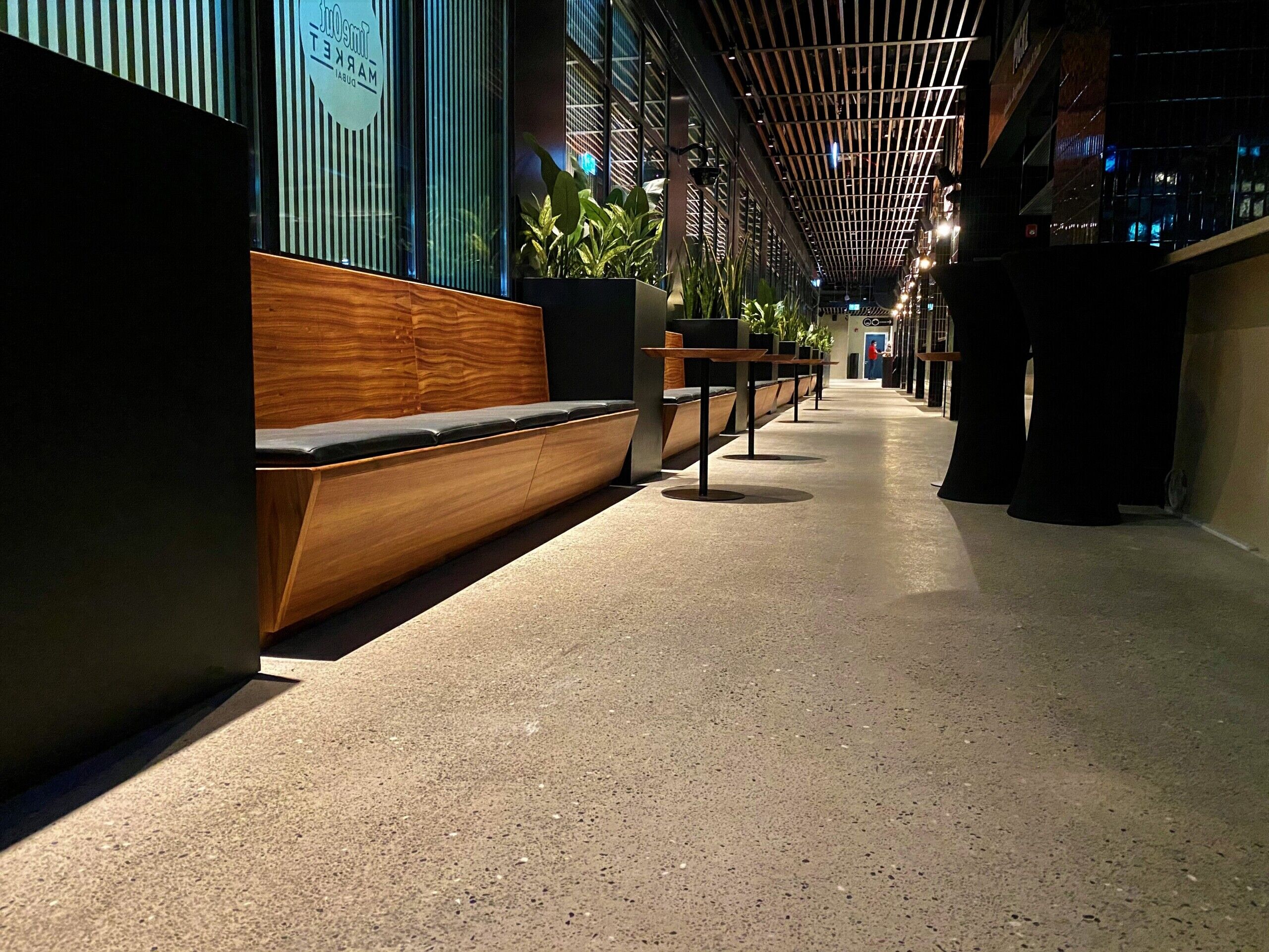 Throughout the entire Time Out Market Dubai, our team of craftsmen were selected to provide a decorative polished concrete with a customised finish to meet the design requirements of the client. Our team worked closely with Dutco Tennant to enhance the aesthetic and provide a solution that promises longevity and easy maintenance. Starting with the application of the cementitious screed, our workforce placed each individual stone in a bespoke formation to keep the design consistent throughout the whole food market. Once applied, our team lightly polished the surface, exposing the custom aggregates and creating a smooth seamless surface. The flooring system is capable of withstanding the continuous foot traffic of the food market and the seamless, easy to clean, qualities will continue to benefit the staff members for years to come.