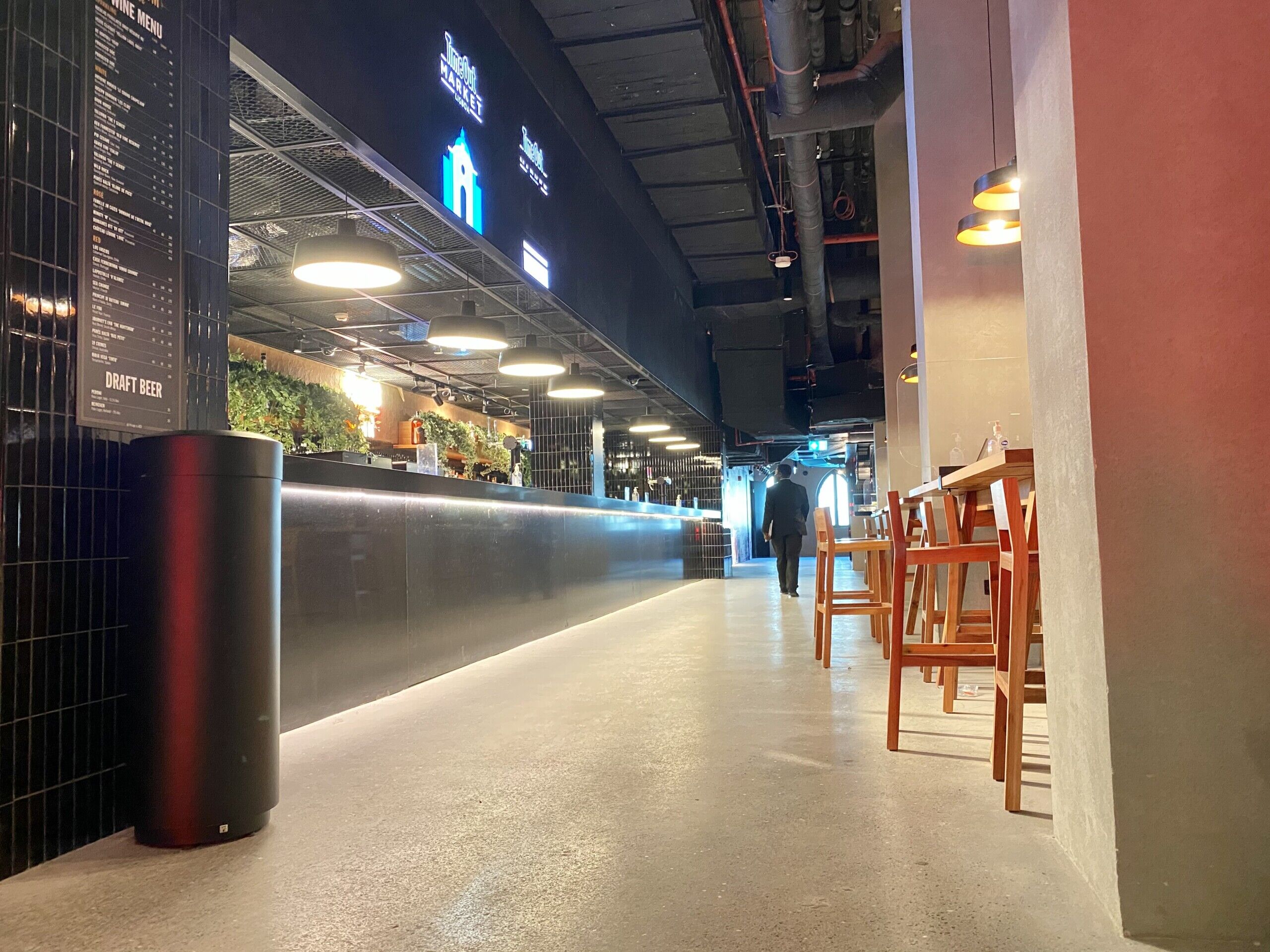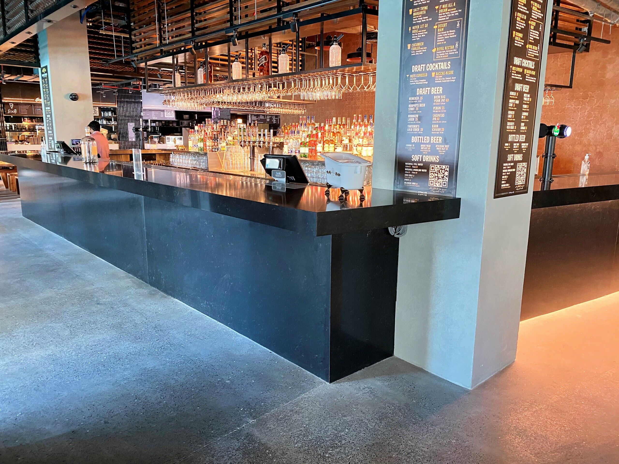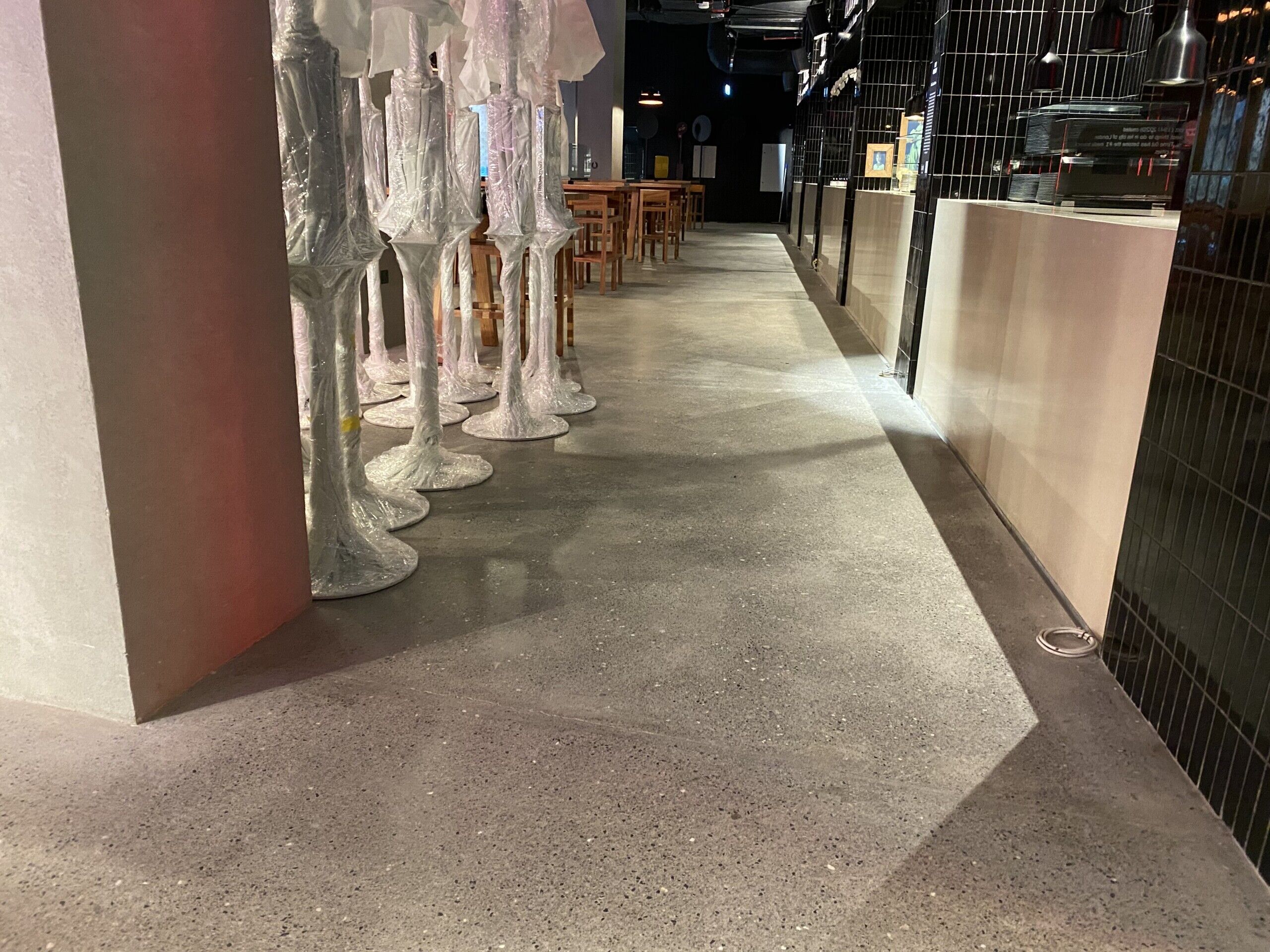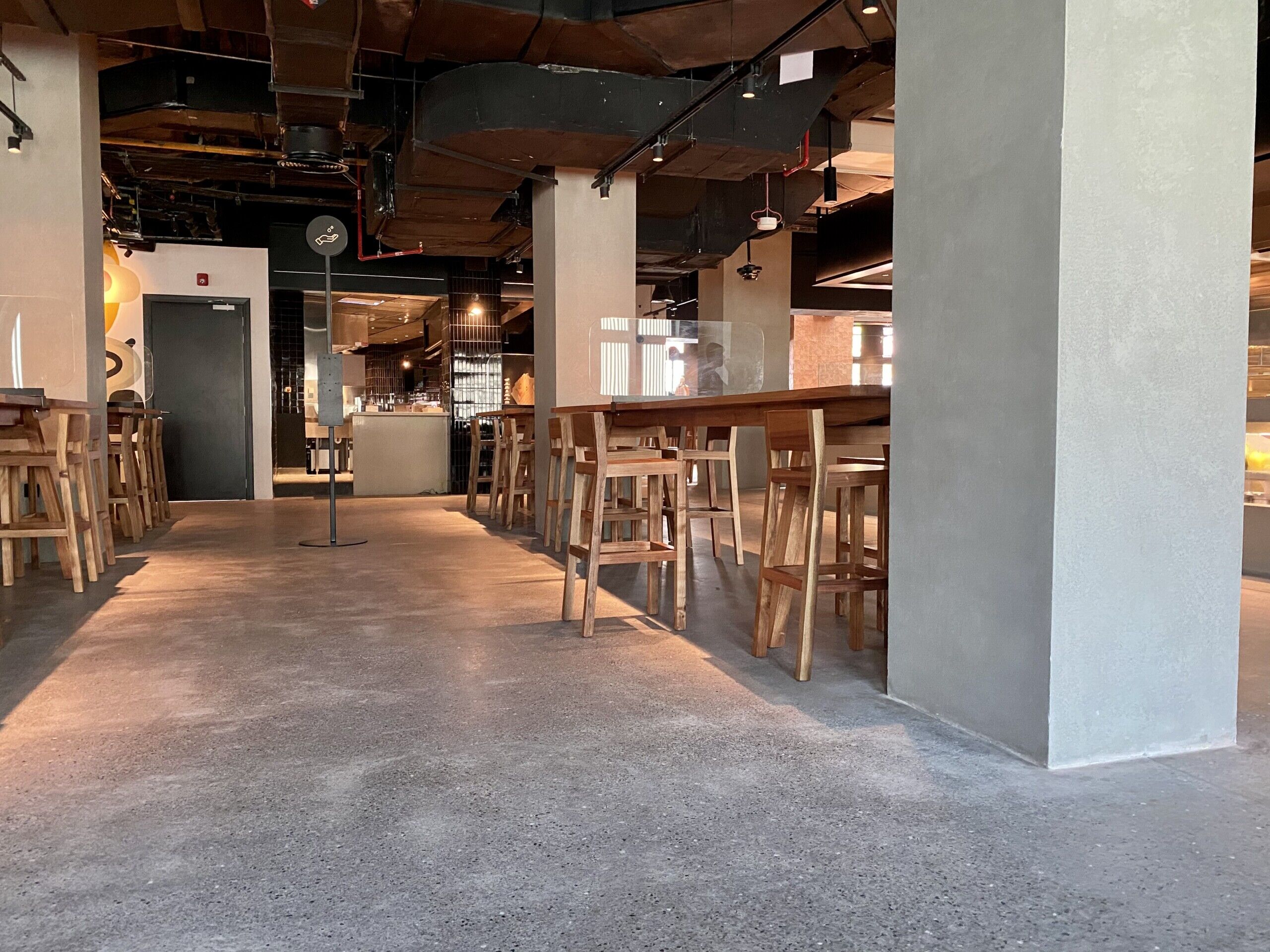 Throughout the entire Time Out Market Dubai, our team of craftsmen were selected to provide a decorative polished concrete with a customised finish to meet the design requirements of the client. Our team worked closely with Dutco Tennant to enhance the aesthetic and provide a solution that promises longevity and easy maintenance. Starting with the application of the cementitious screed, our workforce placed each individual stone in a bespoke formation to keep the design consistent throughout the whole food market. Once applied, our team lightly polished the surface, exposing the custom aggregates and creating a smooth seamless surface. The flooring system is capable of withstanding the continuous foot traffic of the food market and the seamless, easy to clean, qualities will continue to benefit the staff members for years to come.